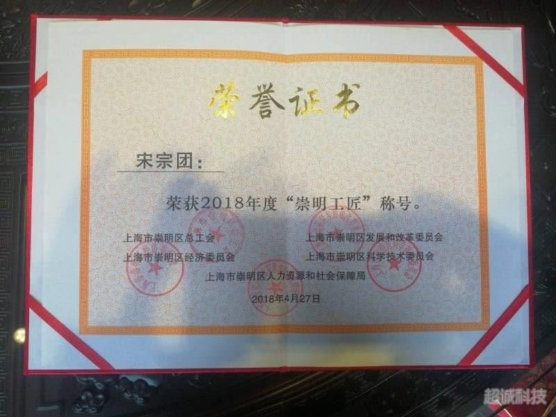 超誠科技宋宗團先生榮獲2018屆崇明工匠以及優(yōu)秀標(biāo)兵